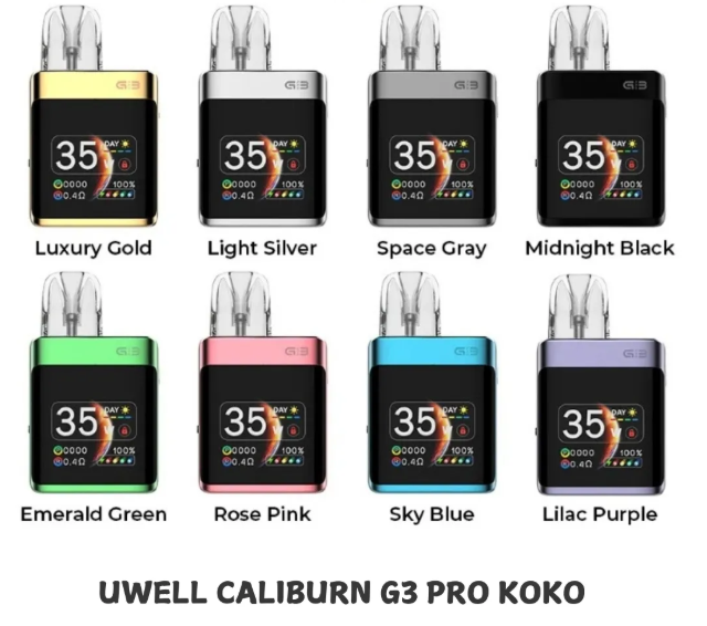 The Uwell Caliburn G3 Pro KOKO Pod System Kit is Features Combining a dynamic Ul, adjustable power, and fine-tuned airflow control, the CALBURN G3 PRO KOKO is truly a powerhouse of a vape. Designed to meet the demands of top performance seekers, it boasts a monster 1.8-inch TFT display for a stunning visual experience, a pro battery of 1250 mah that stands out among its peers, and unlimited customizability to let you define your own vaping modes.